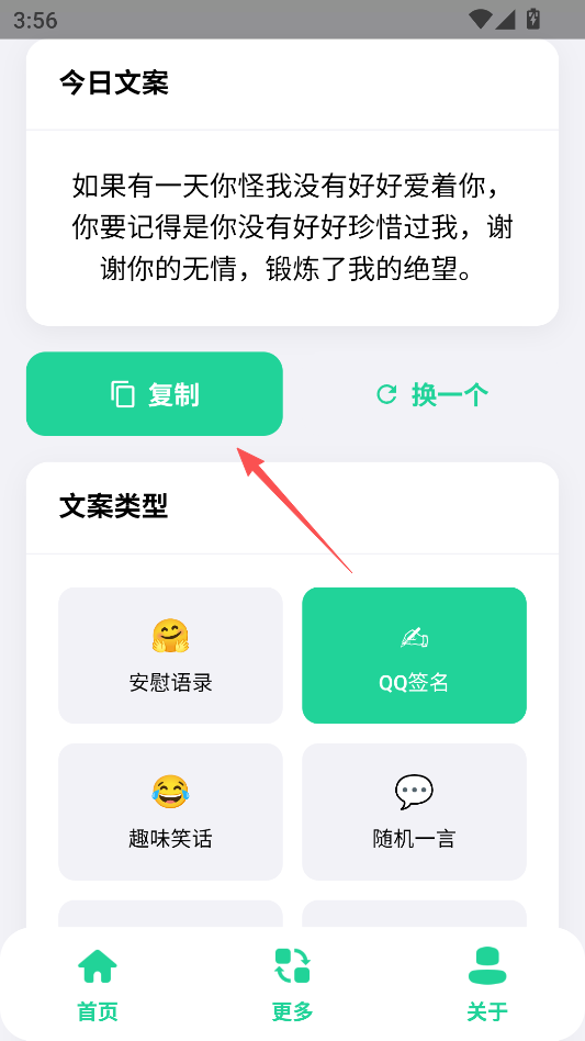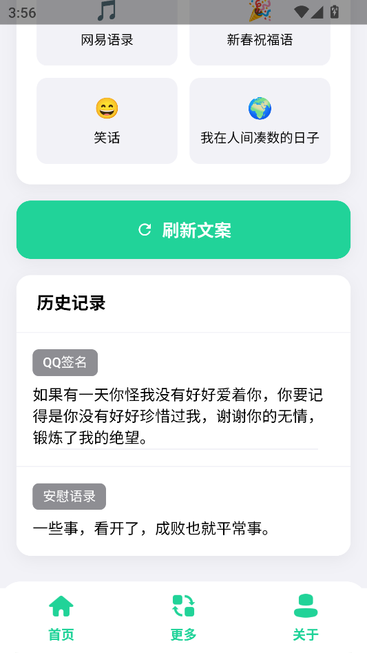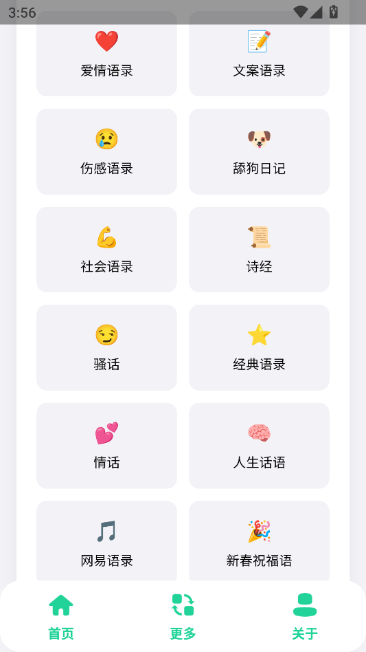 第一个最大亮点是“文案类型全,不用换平台找资源”。很多文案工具只侧重某一类内容,比如只做情感文案或只更短句,这款软件把多种类型的文案整合在一起,励志、情感、短句,甚至还有节日祝福、商业宣传类文案(若有),想找不同类型的文案不用换多个平台,一个软件就能满足大部分需求,省心又高效。