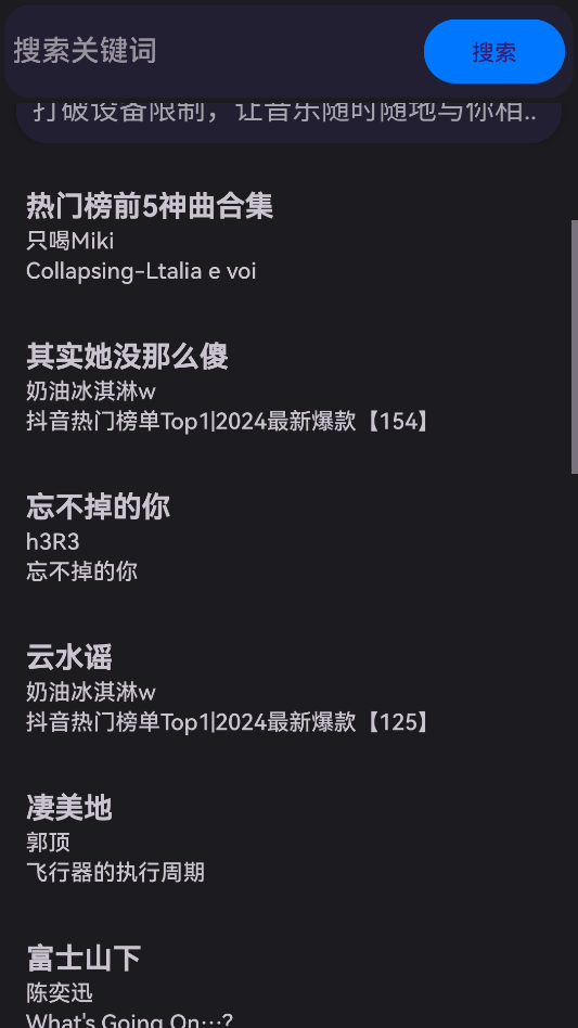 茉莉音乐app最新下载手机版v1.0.1最新版茉莉音乐app最新下载手机版是一款功能丰富的在线音乐播放器,拥有海量热门音乐资源,每日同步更新热门榜单与热门歌单推荐,为用户带来每日新奇听歌体验。支持关键