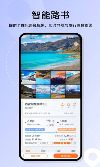 多场景路书服务:不仅提供海量现成路书查询,还能根据自驾、公共交通、步行等不同出行方式定制路线,同时支持旅途中实时搜索周边景点,满足动态规划需求。用户可输入每日时间节点、兴趣偏好,系统会自动优化行程顺序,避免绕路,提升出行效率。
