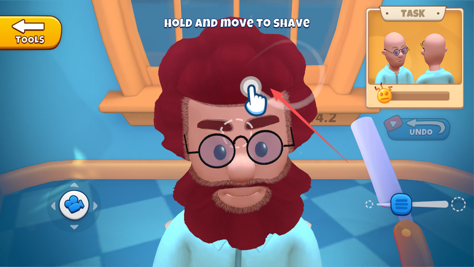 拿上工具就可以开始理发了,按住屏幕在客人头发上拖动即可开始理发