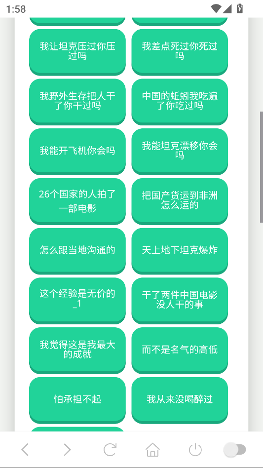第一个最大亮点是 “热门梗更新快,紧跟网络潮流”。只要吴京的新台词成梗,软件里很快就会收录,不会让你错过热门玩梗机会。比如刚刷到 “坦克没有后视镜” 的段子,打开软件就能找到完整语音;等 “夺命八连问” 火起来,对应的分段和完整语音也及时上线,能第一时间用上最新梗,和朋友互动更有话题。
