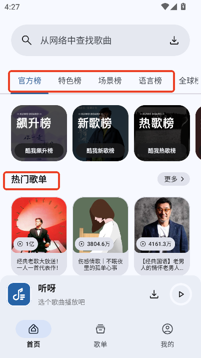 多平台榜单整合:聚合酷我飙升榜、抖音热歌榜、古风音乐榜等多平台热门榜单,同时收录“抖音爆款2025热门歌曲”“经典国语老男人的歌”等特色歌单。用户无需切换多个APP,一站式获取全网热门音乐资源,轻松紧跟音乐潮流。