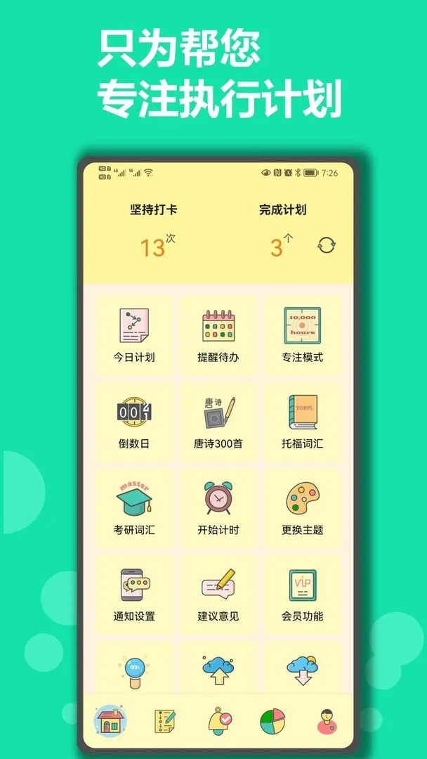 2、提醒灵活:每个计划任务皆能设置闹钟日历提醒,可随时暂停随时继续,还有快捷打卡窗口助力。