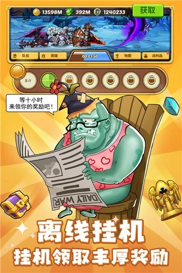 2放置玩法轻松:无需复杂操作与时刻在线,英雄自动战斗,离线也有丰厚奖励。