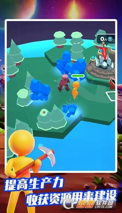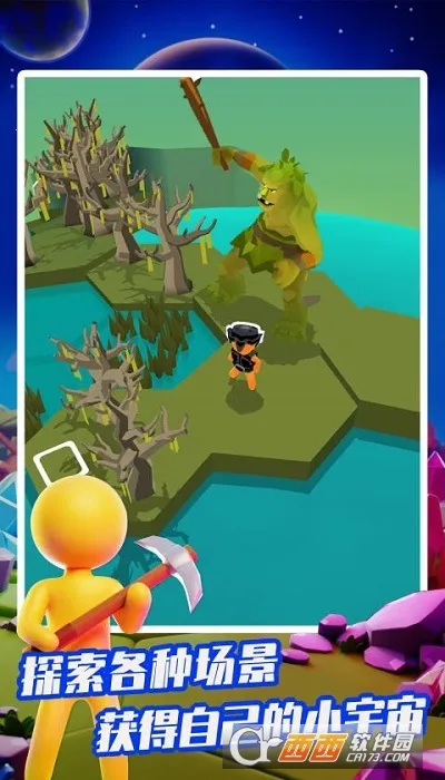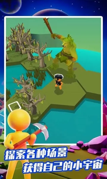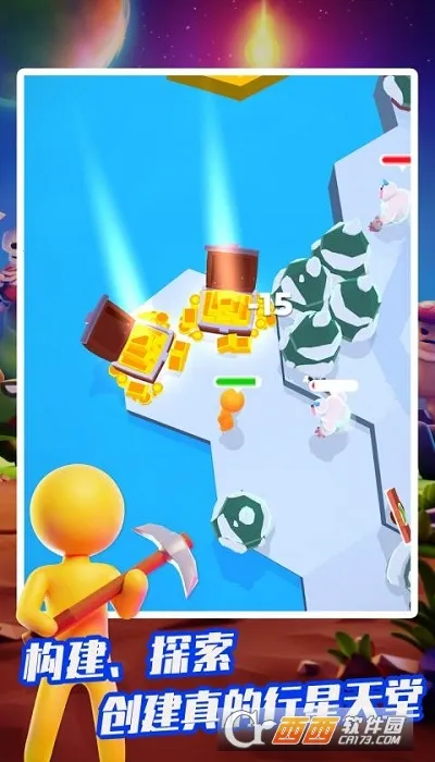 1、自由建造:以宇宙为背景,可自由砍树收集材料,在星球上建造新家园,解锁新区域,开拓领地。