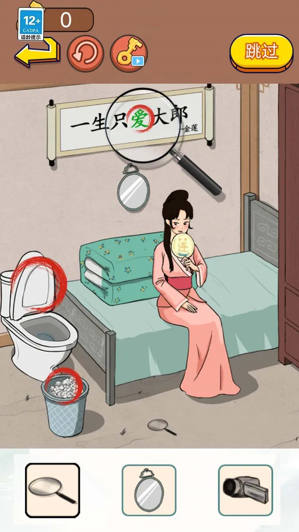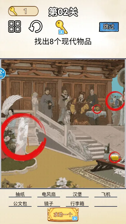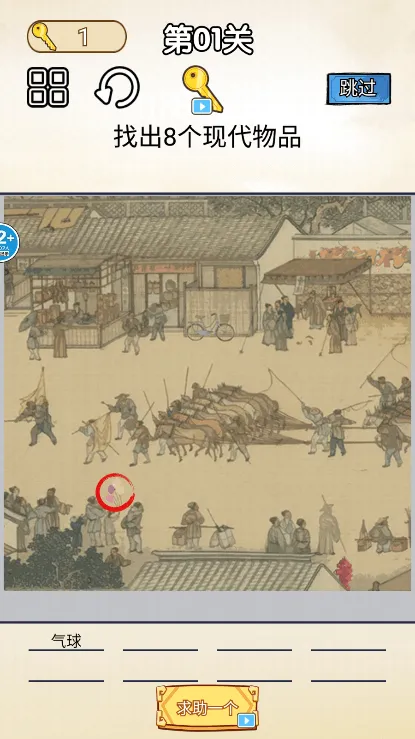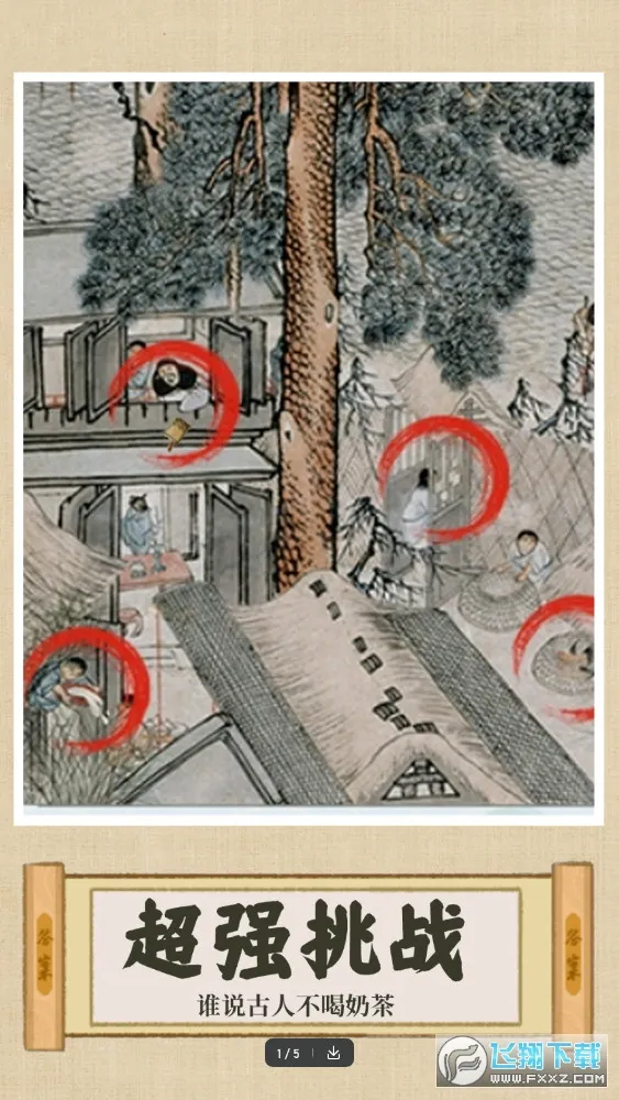 这是一款休闲益智解谜游戏,能带来独特体验。游戏设定极为有趣,像是让玩家在古画中找现代物品,像古代人喝奶茶、古人打游戏机等场景,极大考验逆向思维与眼力。关卡丰富,设计传统又新颖,在不同玩法中,可肆意思索,尽情挑战观测能力。随着关卡推进,难度增加,乐趣也更多。操作简单,只需点击屏幕、滑动手机就能完成如圈出物品、移动画布等动作。玩这款游戏,既能打破常规意识束缚,又能锻炼思维,闲暇时光用来休闲解压、打发时间十分合适 。