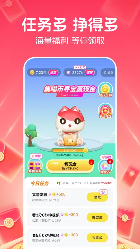 2、赚钱方式多样:新人登录有奖励,每日签到、幸运转盘、开红包、晒收入、玩游戏等多种赚钱任务,刷视频还能边看边领钱。