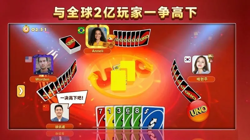 2、社交性强:能与好友组队竞争、在线对战,还可在UNO俱乐部中社交聊天、互赠好礼,甚至能跨国交流。