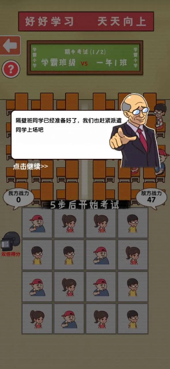 2、玩法独特创新:以学生考试为题材,通过拖动合成同学、派遣考试等方式展开,趣味性十足。