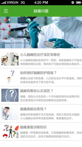 3、资源丰富全面:提供脑瘫病因、症状、康复训练及最新治疗方法等诸多内容。