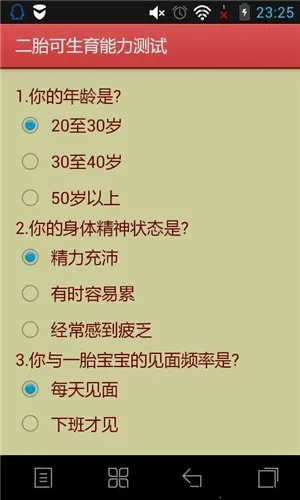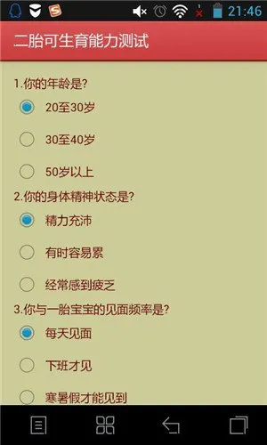 3、方式简单:通过回答7个生活中的问题,即可获得是否有生育二胎能力的参考结果,操作轻松。