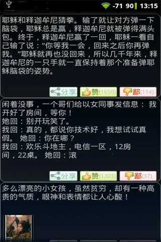 段子合集(笑话大全)1.0 安卓版段子合集为大家精心准备了大量的优质笑话和段子,每天都会让你感受到段子所带来的欢乐。第一时间更新网上热门的段子和恶搞图片,来这里留下你的评论,与更多人一起互动!