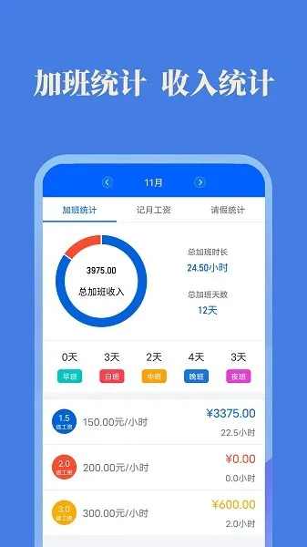 2、统计智能:可自动计算工资、请假扣款,还能统计月总加班天数、时间、工资,以及总请假时间、扣款金额等。