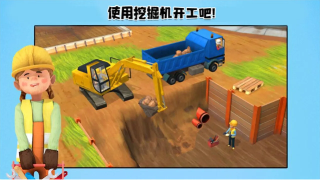 2、玩法丰富多样:在游戏里孩子能驾驶挖掘机、操作起重机等,参与建造房子每一步,可挖地、涂墙泥、填土等。