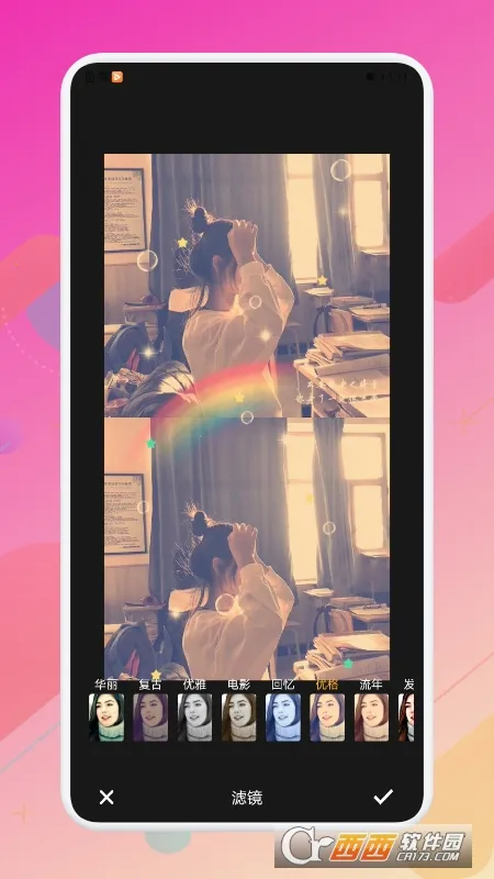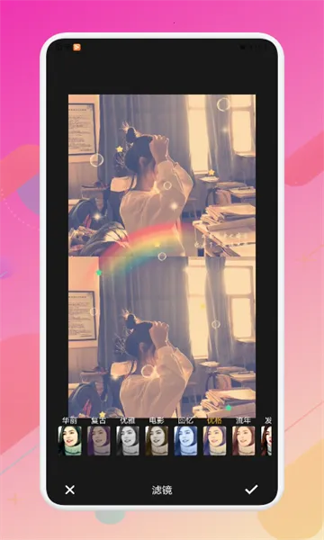 2 滤镜数量多达上百种,涵盖甜美、食物、风景、黑白等各类风格,色彩纷繁任你选。
