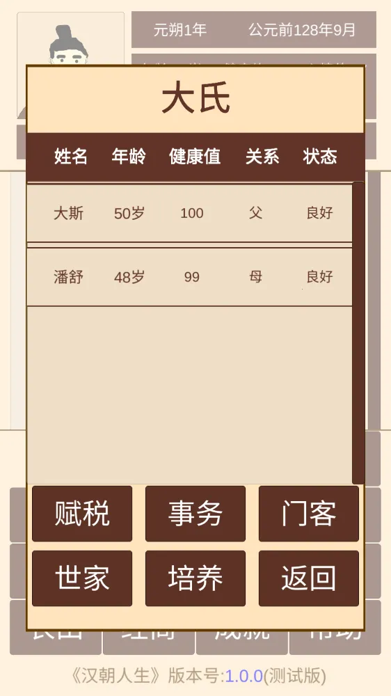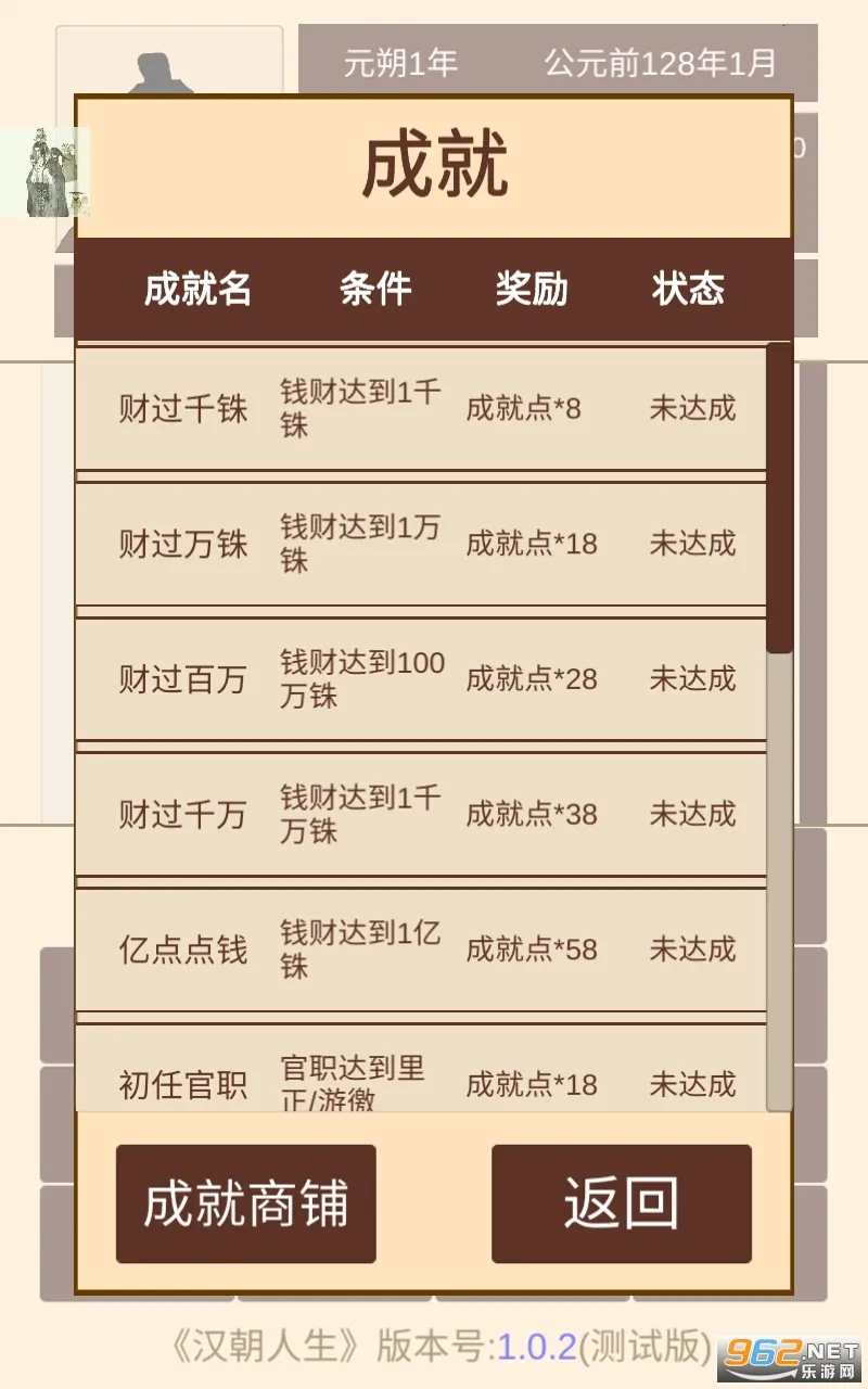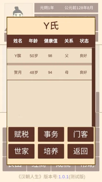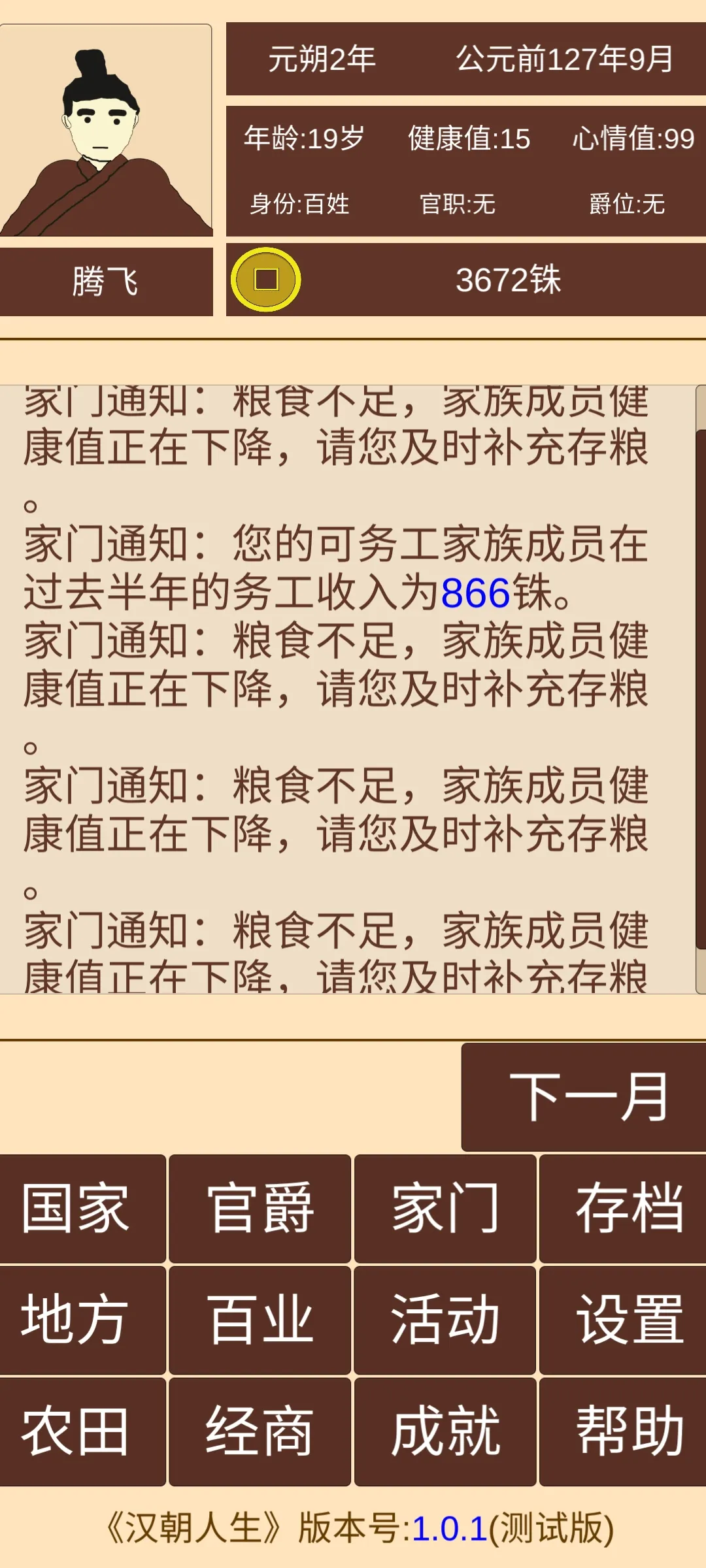 《汉朝人生》是文字模拟游戏,重回西汉,玩家自由选择人生路线,可种田、经商、入朝、自立。有内政、爵位买卖等多样玩法,还有继承系统。能体验丰富人生,了解西汉文化,感受古代风俗。