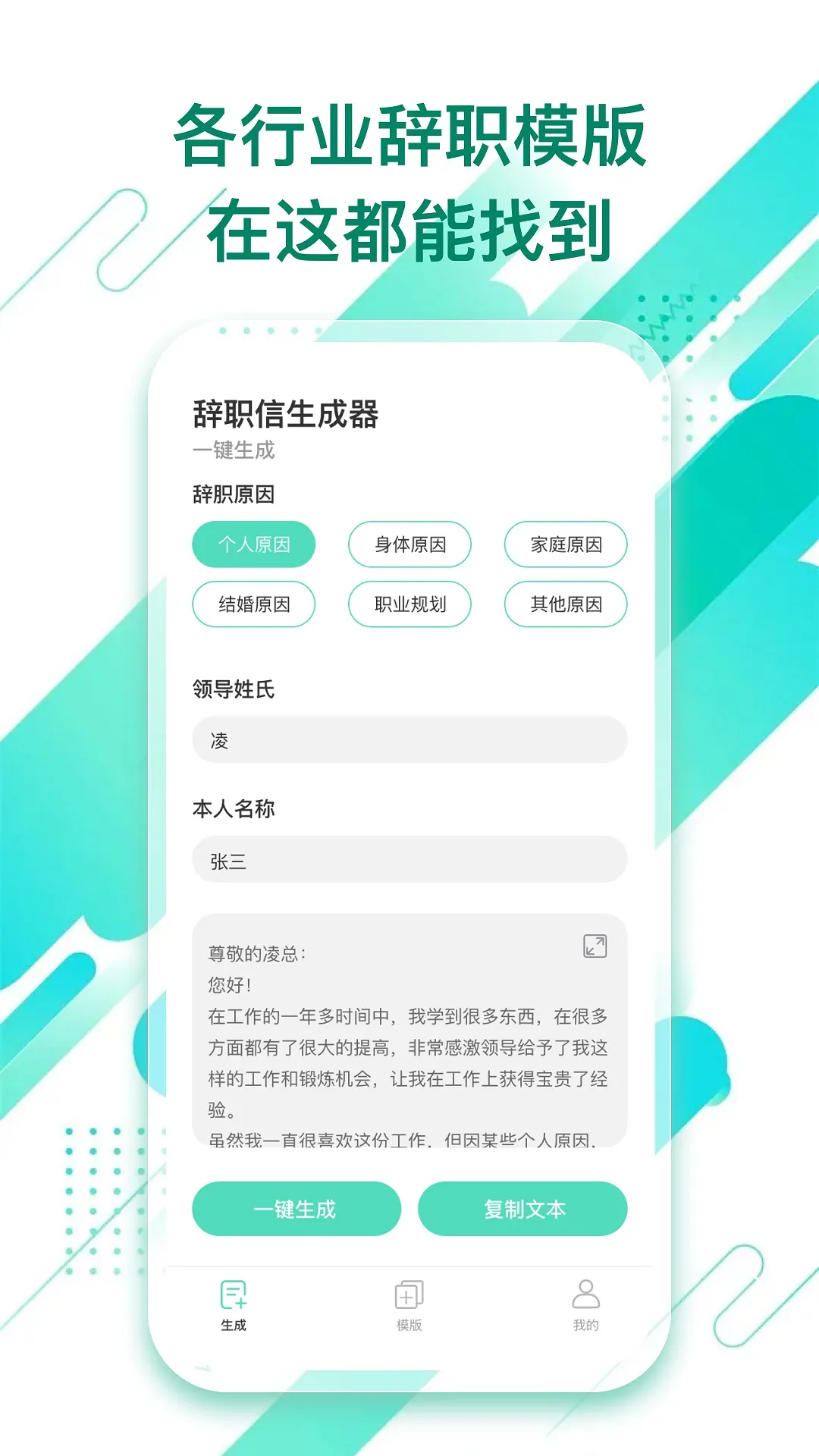 3 个性化定制:支持自定义修改辞职信模板和内容,能按需求调整措辞、语气等,使辞职信更具个性。