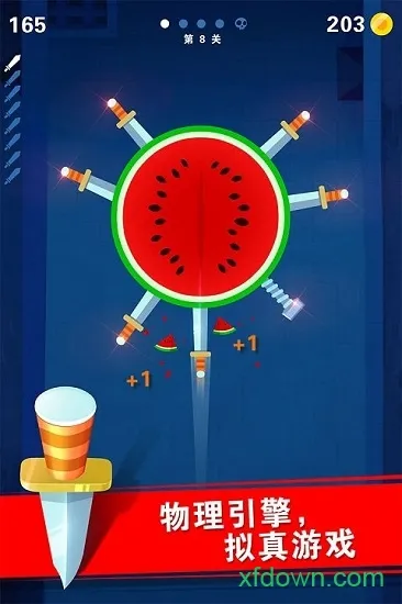 2、精美画面设计:采用精美的画面风格设计,关卡设计精美,画面色彩独特,画风清新可爱,音乐搭配舒适,标靶皮肤丰富,如木头、披萨、西瓜等,能让玩家收获有趣的刺激体验。
