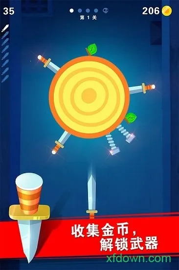 2、简单易上手:玩法简单,玩家只需点击屏幕发射飞刀,新手可从简单难度开始熟悉基础操作与物理弹道特性,手残党也能轻松上手。