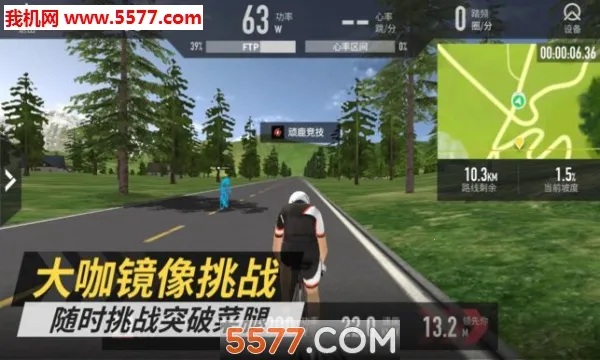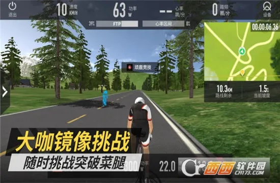 1、真实骑行体验:以实景地图为基础,配合智能骑行台,在游戏场景中模拟户外坡度、风阻、滚阻等真实体感。路线包含平路、丘陵起伏路和山路爬坡路,可随意组合,让你足不出户体验美妙的世界骑行之旅。