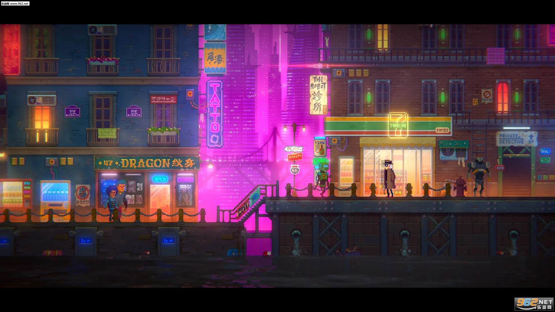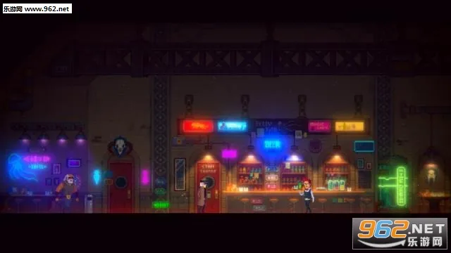 2、匠人精神的手工像素:复古的像素风格,配合精美的特效及灯光表现,将给玩家难忘的视觉体验。像素风赛博朋克象征的霓虹色彩视觉冲击力强,场景细节丰富,NPC动态自然。