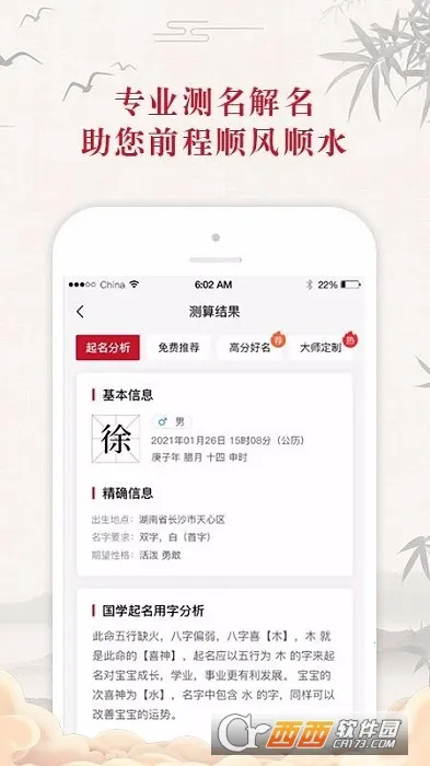4、客观评分分析:拥有独有的四维评分系统,让名字评分更客观全面。兼顾名字音形意和文化印象,提供专业五行命理分析。