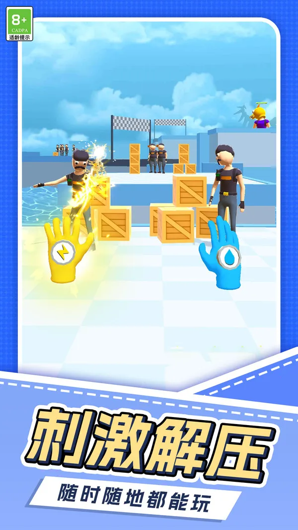 这是一款乐趣十足的休闲竞技游戏,玩家操控神奇技能手套清除关卡匪徒。单独用一只手套威力就不小,双拳齐发更能瞬间制敌。随着关卡推进,解锁更多超能力,战斗方式丰富多样。操作流畅,打击感爽快,每次清匪都有成就感。