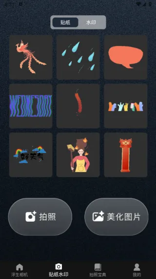 3.在贴纸水印页面中提供了多种贴纸和水印,可以随时进行拍照和美化图片。