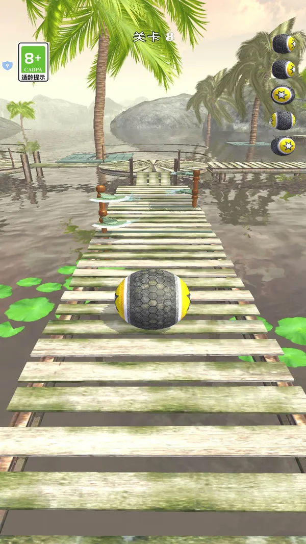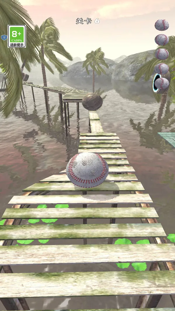 2.紧盯终点方向沿着木桥的延伸路径,保持铁球的直线前进趋势,遇到桥身狭窄处时,减小滑动幅度精准控制铁球平衡避免因偏移掉落水中。