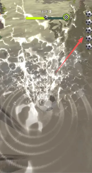3.遭遇落水后快速反应,观察右侧足球的排列,重新规划路径时优先靠近足球区域,借助足球的 “借力” 效果调整铁球方向。