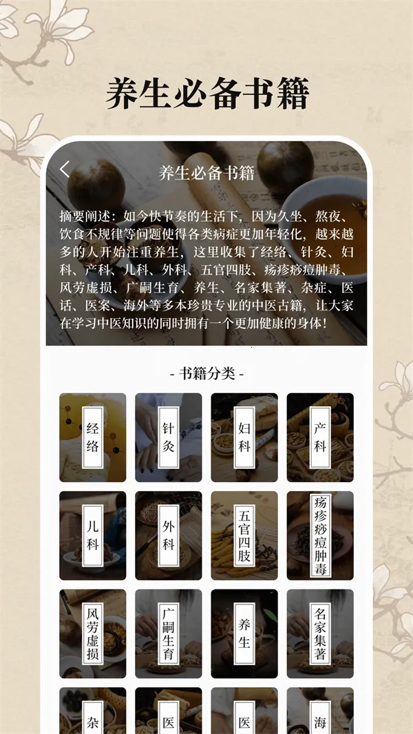 1、海量古籍宝典:收集了从古至今中医养生相关的海量精华孤本,包含历代名家医案、医学经典著作以及名老中医的宝贵经验著作,供读者参考学习。
