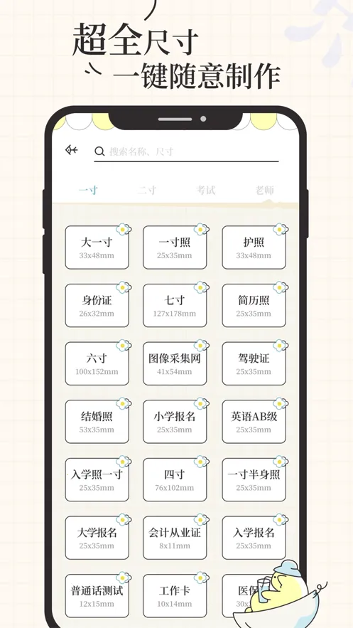 1、尺寸场景丰富:不仅包含一寸、两寸等常规证件照尺寸,还人性化地为用户提供身份证、驾驶证、百余种考试等各种场景选择,满足全场景使用需求。