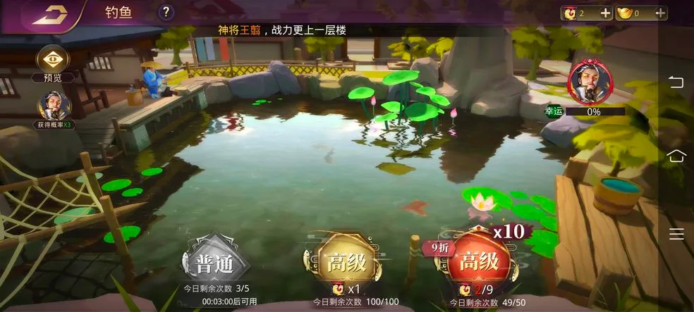 2、神将招募玩法新颖:以钓鱼池招募文臣武将,体现“姜太公钓鱼,愿者上钩”的理念,比传统抽卡更具特色,还能博览武将前事今生,甚至逆转因果,让心仪武将免于重蹈历史覆辙。