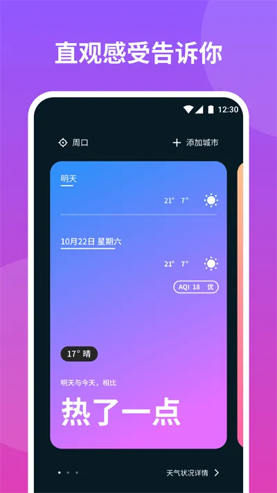 3、使用便捷:系统会自动更新当地天气,不用手动切换城市;不方便看手机时,语音播报功能可读出天气信息。