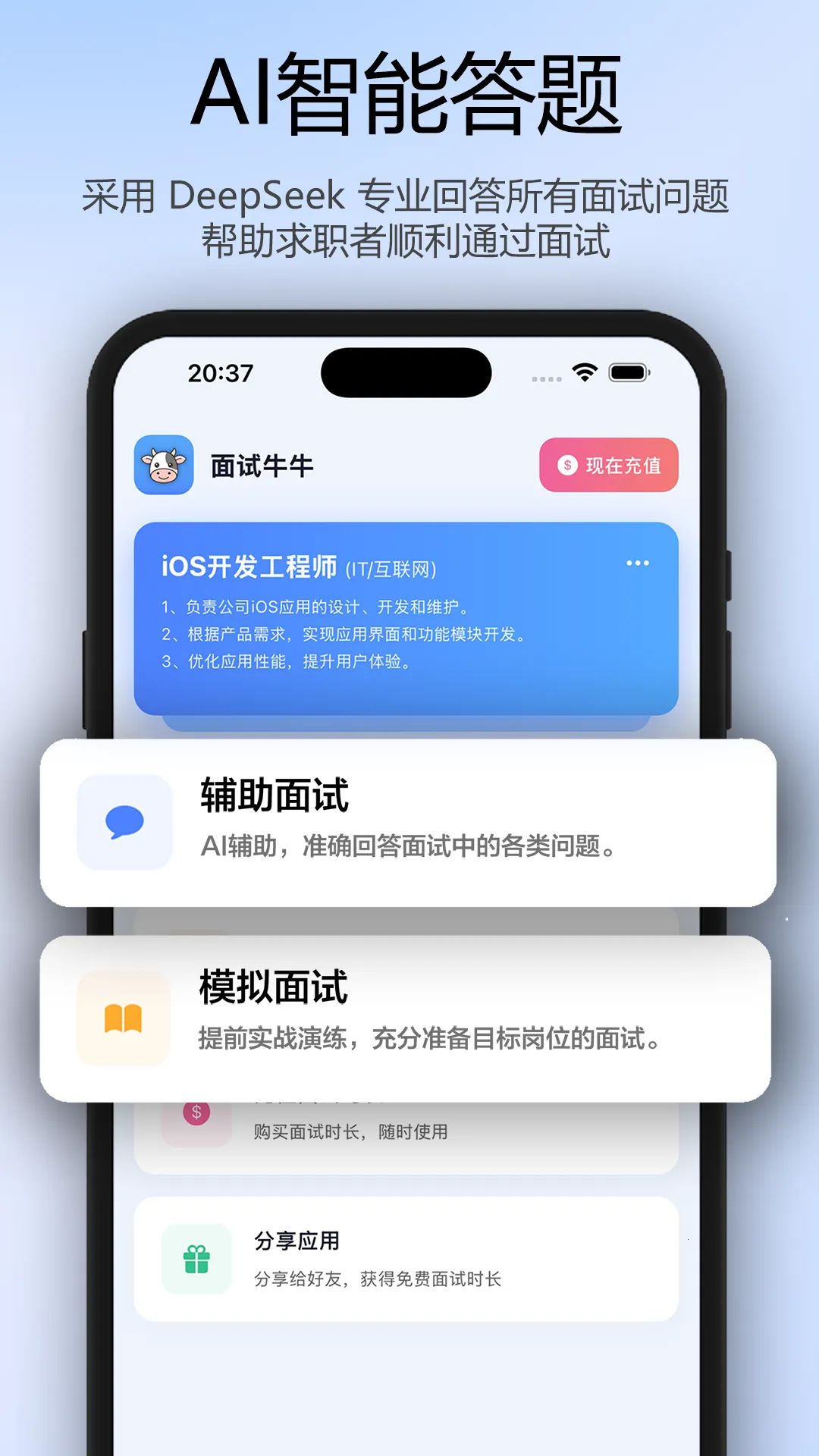 面试牛牛安卓版是变量定义深圳科技有限公司开发的智能AI面试助手。它功能丰富,覆盖多行业岗位,可自定义场景难度,能模拟面试、智能答题,还严格保护用户隐私,助你提升面试技巧,高效求职。