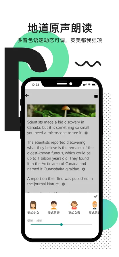 2、发音纯正专业:通过高质量的发音技术营造纯正语言环境,还提供多种不同的声态组合,能根据文本生成纯正发音的听力音频,可选择不同音色、男女老少及英式美式发音,帮助用户优化发音。