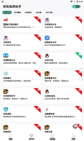 老街画质助手这类工具简直是游戏玩家的福音!它能一键解锁最佳画质,提升操作流畅度,支持多种分辨率,让游戏画面超清晰。还能全面支持各种手机,适配香肠派对、和平精英等多款热门游戏,轻松提升视觉体验。操作超简单,无需复杂的Root操作,人人都能上手。它能极速解锁120帧,带来绝佳流畅度,还有出色的性能优化,充分释放手机性能。不仅如此,还有广角视野效果,能让你一览战场。个性化美化专区还能定制角色服装等。有了它,不管手机配置咋样,都能在游戏里更强大、更自信。能帮咱清晰看到游戏每个细节,提升流畅度,轻松应对对枪游戏啥的。而且使用安全可靠,不修改游戏核心文件,避免封号风险。总之,想提升游戏画质,就靠它啦!
