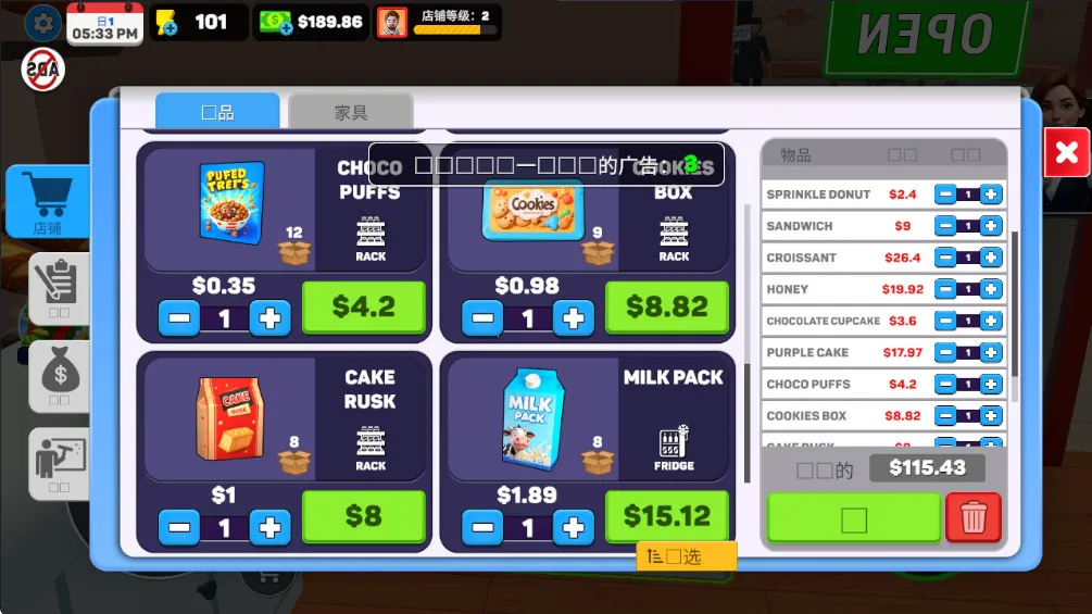 自主定价:玩家能够在货架上放置各类不同的面包和甜品,还拥有设定出售价格的自主权。