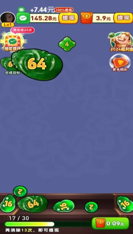 翡翠大富豪是一款充满趣味的游戏。在游戏里,你能体验数字合成带来的减压氛围。它玩法简单,类似解冻2048,点击数字就能加入合成选择突破。操作也很方便,滑动屏幕就能灵活进行数字合并,比如删除等级数字追加来连击获取更高分数。游戏特色满满,有一次性消除与同色数值对应宝石合成强化,整合数字与拼图元素,让你放松突破难关,还能挑战合成2048。亮点也不少,像把数字合成和消除玩法结合,营造百变燃烧脑细胞的真实氛围,参加精彩的三消冒险盛宴。说到大家关心的提现问题,游戏中是可以提现的。你通过合成数字收获点数,完成相关任务就能提现,轻松把游戏中的收获变成实实在在的收益,快来加入翡翠大富豪,享受冒险解压又能提现的乐趣吧!