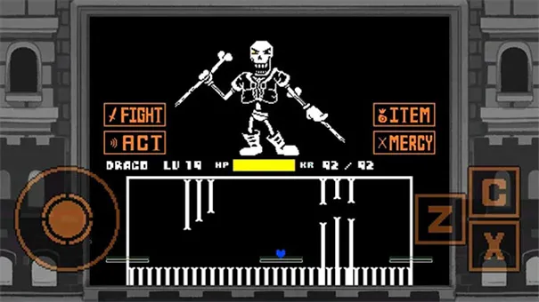 游戏里,你要和被神秘力量影响的Papyrus在审判厅战斗。有多种闯关模式可选,像普通、困难、无尽挑战模式等。操作也不难记,Z或Enter确定,X或Shift取消,C或Ctrl是菜单,F4满屏,Hold Esc退出,HP为0就失败。