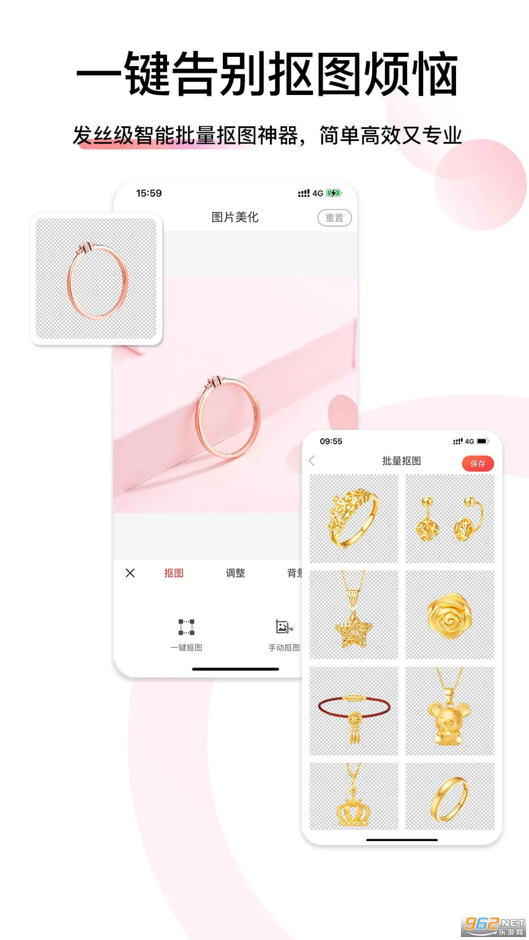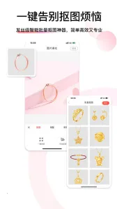 2. 抠图超高效:选择图片后一键出抠图结果,基于AI智能算法技术,是发丝级抠图神器,大大提升抠图效率。复杂图片还能配合橡皮擦等多种工具修正结果,确保专业完美的珠宝饰品抠图效果。