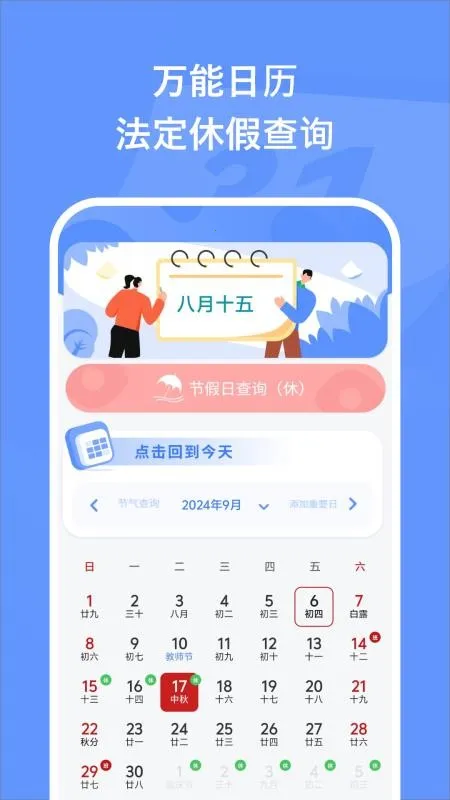 1. 多模式精准计算:拥有多种节假日计算模式,能精准查询假期和调休日,让你对放假安排了如指掌。