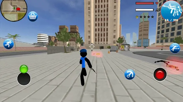 这款火柴人警匪手游超好玩!操作简单易上手,滑动虚拟摇杆就能控制火柴人移动、奔跑,右侧按键指挥攻击、发射武器和踢腿。