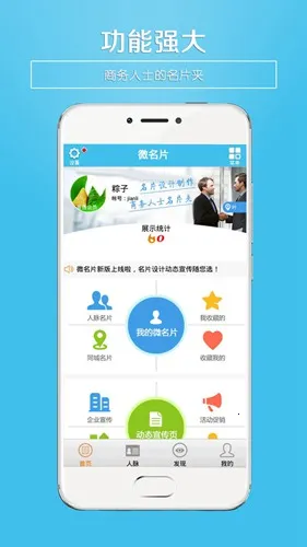 微名片是一款超棒的手机名片管理应用程序。它能帮你轻松创建电子名片,还能扫描识别纸质名片并转为电子版。你可以添加个性化头像、座右铭和签名等。功能超丰富,能导入手机联系人获取已用微名片的好友,人脉管理便捷,可拖拽分组、智能搜索、云端备份。能通过多种方式查找好友交换名片,近距离滑动屏幕就能与好友完成名片交换和微博互粉。名片信息变更会自动通知互换名片的好友。它还是免费的电子名片,提供一站式服务,有多种模板可选。加入多媒体元素,图文声像并茂,全方位宣传效果好。携带方便,能手机转发、随时更新修改。成本低,制作随用随做,无需最小订货量,减少资源浪费。适用于任何商家、企事业,是拓展人脉、展示形象的好帮手。