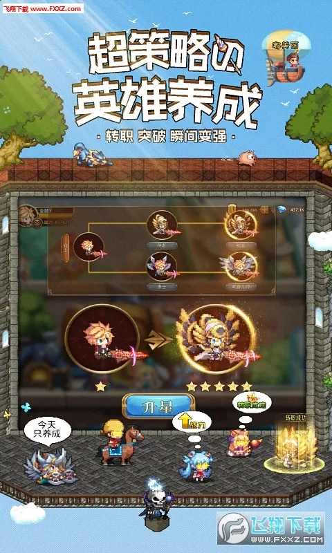 策略英雄养成:可合理搭配冒险阵容,有数十种英雄转职选择。不同角色分工不同,通过技能搭配打造专属神器,能组建独一无二的五人冒险小队。