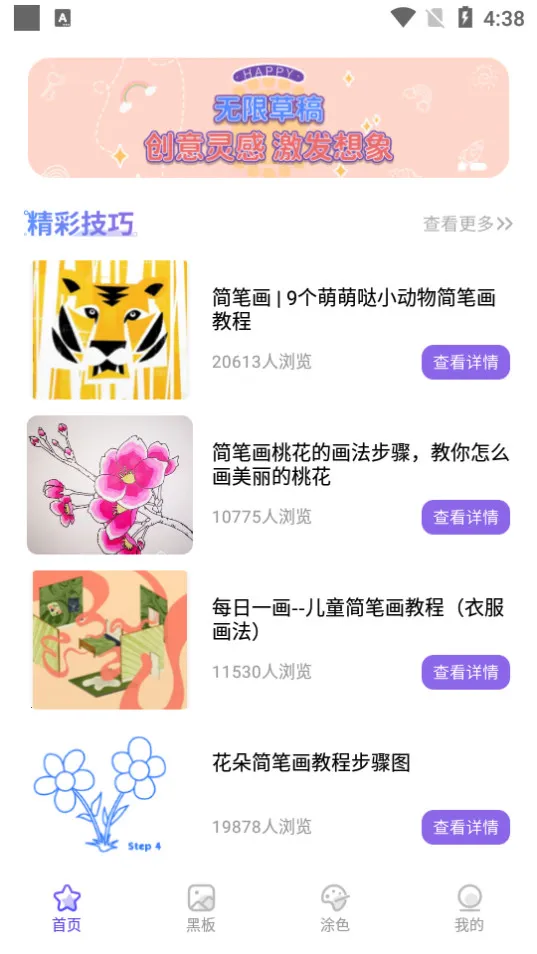 prcorcte绘画app官方最新版v1.1最新版prcorcte绘画app官方最新版是一款功能丰富,便捷实用的手机绘画软件。内置大量绘画教学内容,包含零基础绘画课程与速写每日课程学习,为绘画领域新手小白提供详细的教学内容。涵盖精选漫画,常见动物,简绿植等多种分类的线稿临摹模板,用户可以通过软件进行自由创