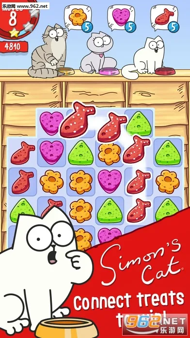 西蒙的猫安卓版是根据同名动画改编的休闲消除手游。吃货西蒙猫食物被乌鸦叼走,要连线消除抢回美食,类似传统三消但自由度更高,支持多方向消除,有400关卡、魔性音乐及搞笑画面,还有多种玩法模式。