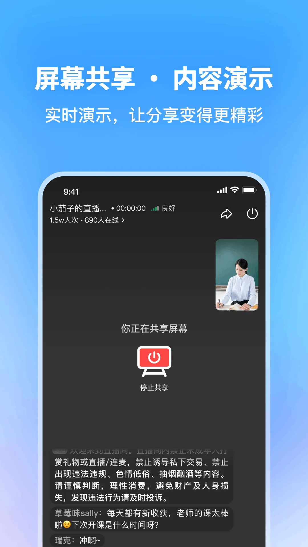 2. 功能丰富:拥有快速创建直播、高级美颜、连麦互动、屏幕共享、成员管理等丰富功能,还支持课件演示和文件盘等功能,极大提升直播专业性和互动性。