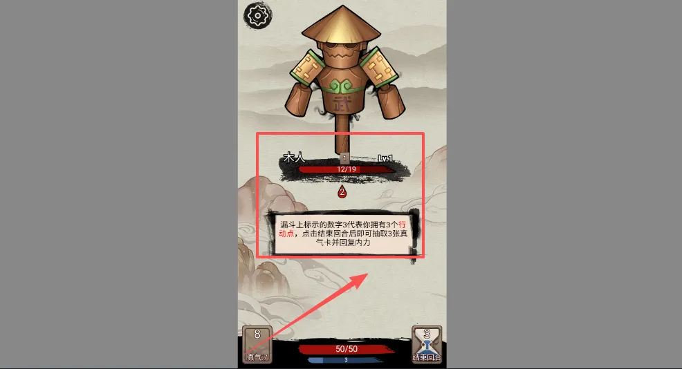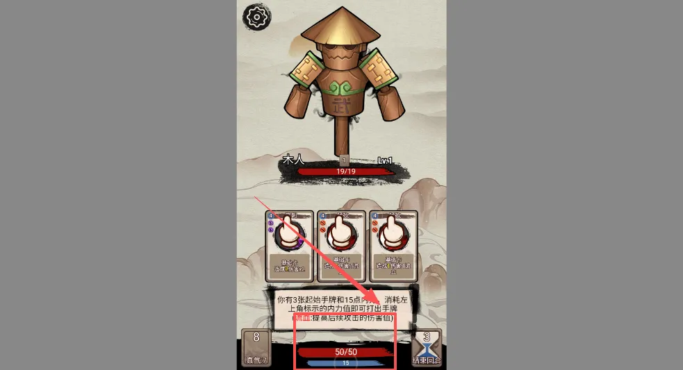 3、然后注意屏幕下方的提示,回合结束时点击“结束回合”按钮,系统会为你抽取3张真气卡片,用于回复内力,确保下一回合的行动资源。