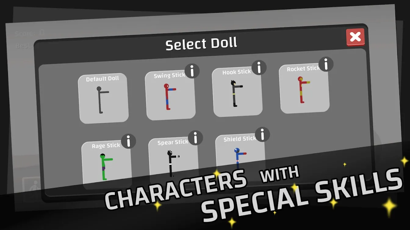 这是一款操作简单的游戏,按住并释放可跳跃,在更大关卡和更多致命陷阱中疯狂挑战。能使用交通工具、道具和工具包摧残火柴人,目标是在游戏里尽可能多地获取分数。